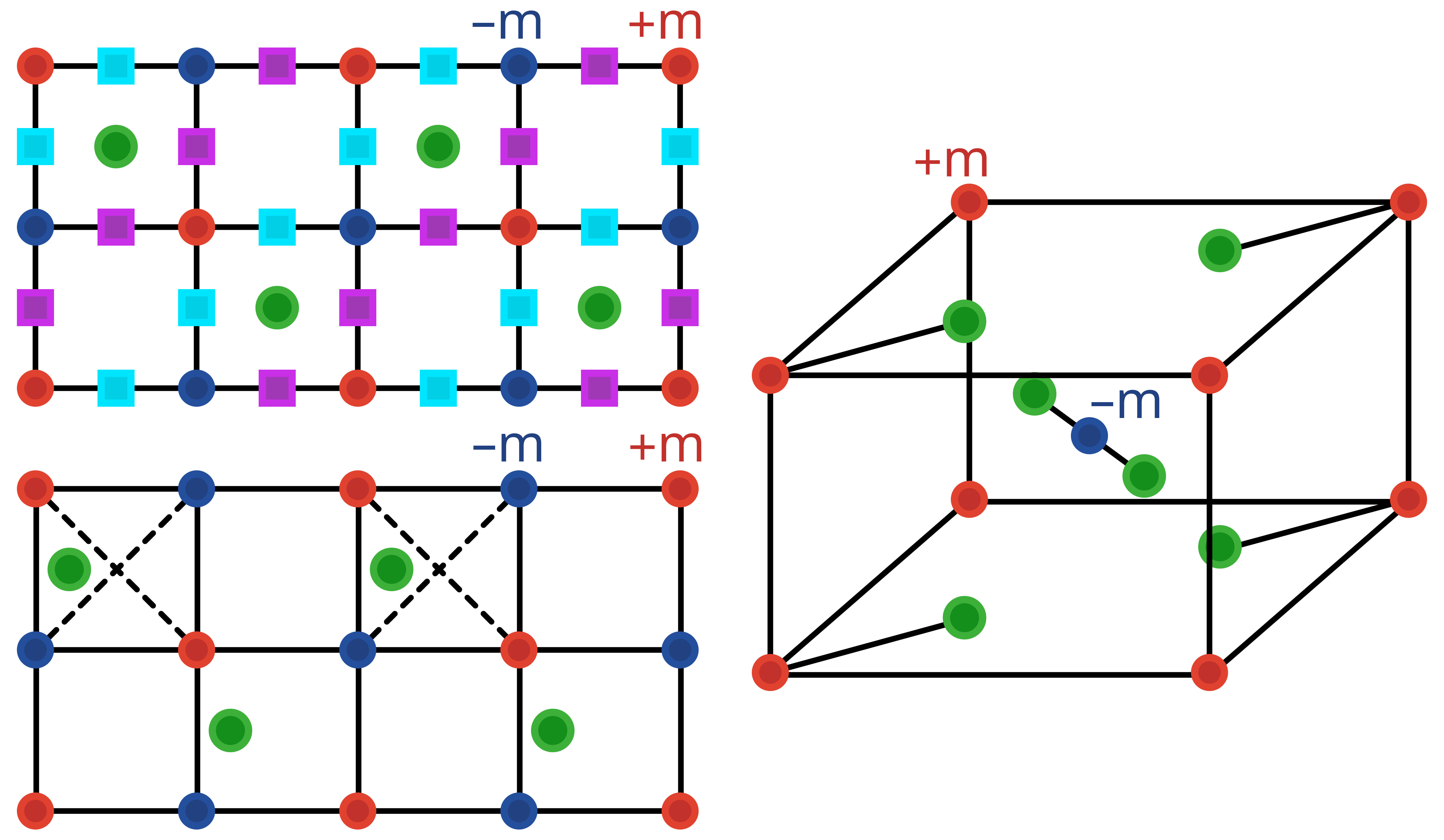 Figure 1: A minimal models of a collinear N\'{e}el ordered d-wave antiferromagnet on a square lattice, ferrimagnet on a square lattice and weak ferromagnet on rutile lattice, illustrating the magnetic (±m) and non-magnetic (green, purple and cyan) sites. This lattice geometry, along with specific symmetry breaking, underpins the emergence of AHE.