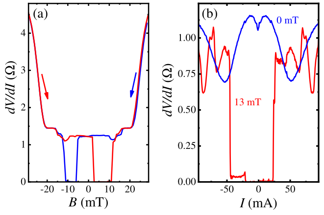 (a) Josephson spin-valve effect as the dV /dI(B) curves reversal for two opposite magnetic field sweep directions at 30 mk temperature. The zero-resistance region is not only shifted to finite magnetic fields, but the dV /dI(B) curves are mirrored in respect to zero field,