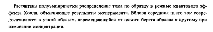 Рассчитано полуэмпирически распределение тока по образцу в режиме квантового эффекта Холла, объясняющее результаты эксперимента. Вблизи середины плато ток сосредотачивается в узкой области: перемещающейся от одного берега образца к другому при изменении концентрации.