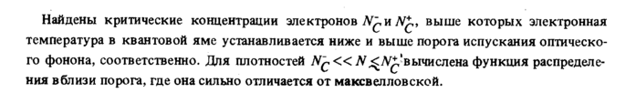 Найдены критические концентрации электронов Л£ и Л£, выше которых электронная температура в квантовой яме устанавливается ниже и выше порога испускания оптического фонона, соответственно. Для плотностей Νς « Л^Л^'вычислена функция распределения вблизи порога, где она сильно отличается от максвелловской.