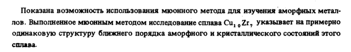 Показана возможность использования мюонного метода для изучения аморфных металлов. Выполненное мюонным методом исследование сплава Си, 0Zr7 указывает на примерно одинаковую структуру ближнего порядка аморфного и кристаллического состояний этого сплава.