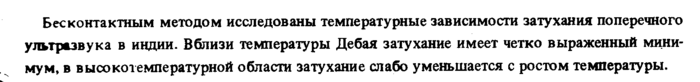 Бесконтактным методом исследованы температурные зависимости затухания поперечного ультразвука в индии. Вблизи температуры Дебая затухание имеет четко выраженный минимум, в высокотемпературной области затухание слабо уменьшается с ростом температуры.