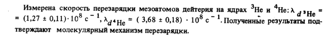Измерена скорость перезарядки мезоатомов дейтерия на ядрах Не и Не;*^эце = = (1,27 ± 0,11)· 108 с" \ \^4Не = (3,68 ±0,18) · 108 с " К Полученные результаты подтверждают молекулярный механизм перезарядки.
