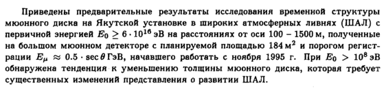 Приведены предварительные результаты исследования временной структуры мюонного диска на Якутской установке в широких атмосферных ливнях (ШАЛ) с первичной энергией Ео > 6 · 101в эВ на расстояниях от оси 100 1500 м, полученные на большом мюонном детекторе с планируемой площадью 184 м2 и порогом регистрации Εμ и 0.5 · весвГэВ, начавшего работать с ноября 1995 г. При Ео > 108эВ обнаружена тенденция к уменьшению толщины мюонного диска, которая требует существенных изменений представления о развитии ШАЛ.