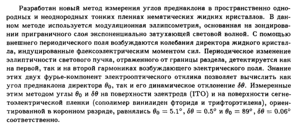 Разработан новый метод измерения углов преднаклона в пространственно однородных и неоднородных тонких пленках нематических жидких кристаллов. В данном методе используется модуляционная эллипсометрия, основанная на зондировании приграничного слоя экспоненциально затухающей световой волной. С помощью внешнего периодического поля возбуждаются колебания директора жидкого кристалла, индуцированные флексоэлектрическим моментом сил. Периодическое изменение эллиптичности светового пучка, отраженного от границы раздела, детектируется как на первой, так и на второй гармониках возбуждающего электрического поля. Знание этих двух фурье-компонент электрооптического отклика позволяет вычислить как угол преднаклона директора во, так и его динамическое отклонение δθ. Измеренные этим методом углы во и δθ на поверхности электрода (ΙΤΟ) и на поверхности сегне-тоэлектрической пленки (сополимер винилиден фторида и трифторэтилена), ориентированной в коронном разряде, равнялись во — 5.1°, δθ — 0.5° и во = 89°, δθ = 0.06° соответственно.