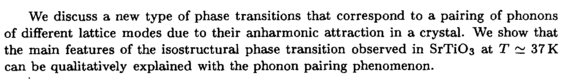 We discuss a new type of phase transitions that correspond to a pairing of phonons of different lattice modes due to their anharmonic attraction in a crystal. We show that the main features of the isostructural phase transition observed in SrTiOs at Τ ~ 37 К can be qualitatively explained with the phonon pairing phenomenon.