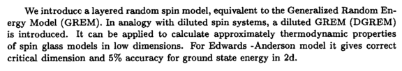 We introduce a layered random spin model, equivalent to the Generalized Random Energy Model (GREM). In analogy with diluted spin systems, a diluted GREM (DGREM) is introduced. It can be applied to calculate approximately thermodynamic properties of spin glass models in low dimensions. For Edwards -Anderson model it gives correct critical dimension and 5% accuracy for ground state energy in 2d.