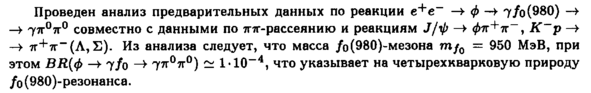 Проведен анализ предварительных данных по реакции е+е~ ->· φ -+ 7/0(980) -» —► 77г°7г° совместно с данными по ππ-рассеянию и реакциям J/φ —> 0π+π~, К~р —> -> π+7Γ~(Λ, Σ). Из анализа следует, что масса /о(980)-мезона т/0 = 950 МэВ, при этом ВЩф ->■ 7/0 -> 7π°π°) ~ 1Ί0-4, что указывает на четырехкварковую природу /о (980)-резонанса.