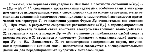 Показано, что корневая сингулярность Ван Хова в плотности состояний v(Ep) ~ ~ (Ер — Ео)-1/2, связанная с протяженными седловыми особенностями в электронном спектре высокотемпературных сверхпроводников на основе купратных металло-оксидных соединений дырочного типа, приводит к немонотонной зависимости критической температуры Тс от положения уровня Ферми Ef относительно дна седловин ЕоПри этом, в результате сокращения расходимости v(Ep) в перенормированной за счет эффектов сильной связи константе электрон-электронного взаимодействия, Тс стремится к нулю в пределе Ер —» Ео, в отличие от приближения слабой связи, в рамках которого Тс стремится к конечному (близкому к максимальному) значению при Ер —► ЕоЗависимость Тс от концентрации допированных дырок, полученная в приближении сильной связи, качественно согласуется с экспериментальными данными для передопированных купратных металлооксидов.