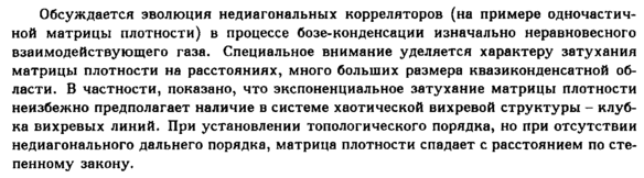 Обсуждается эволюция недиагональных корреляторов (на примере одночастич-ной матрицы плотности) в процессе бозе-конденсации изначально неравновесного взаимодействующего газа. Специальное внимание уделяется характеру затухания матрицы плотности на расстояниях, много больших размера квазиконденсатной области. В частности, показано, что экспоненциальное затухание матрицы плотности неизбежно предполагает наличие в системе хаотической вихревой структуры клубка вихревых линий. При установлении топологического порядка, но при отсутствии недиагонального дальнего порядка, матрица плотности спадает с расстоянием по степенному закону.