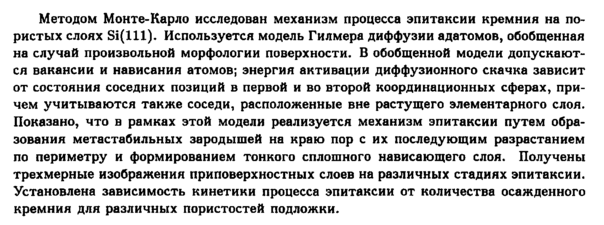 Методом Монте-Карло исследован механизм процесса эпитаксии кремния на пористых слоях Si(lll). Используется модель Гилмера диффузии адатомов, обобщенная на случай произвольной морфологии поверхности. В обобщенной модели допускаются вакансии и нависания атомов; энергия активации диффузионного скачка зависит от состояния соседних позиций в первой и во второй координационных сферах, причем учитываются также соседи, расположенные вне растущего элементарного слоя. Показано, что в рамках этой модели реализуется механизм эпитаксии путем образования метастабильных зародышей на краю пор с их последующим разрастанием по периметру и формированием тонкого сплошного нависающего слоя. Получены трехмерные изображения приповерхностных слоев на различных стадиях эпитаксии. Установлена зависимость кинетики процесса эпитаксии от количества осажденного кремния для различных пористостей подложки.
