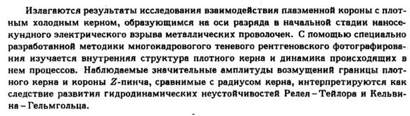 Излагаются результаты исследования взаимодействия плазменной короны с плотным холодным керном, образующимся на оси разряда в начальной стадии наносе-кундного электрического взрыва металлических проволочек. С помощью специально разработанной методики многокадровогого теневого рентгеновского фотографирования изучается внутренняя структура плотного керна и динамика происходящих в нем процессов. Наблюдаемые значительные амплитуды возмущений границы плотного керна и короны £Г-пинча, сравнимые с радиусом керна, интерпретируются как следствие развития гидродинамических неустойчивостей Релея Тейлора и Кельвина Гельмгольца.