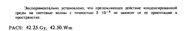 Экспериментально установлено, что преломляющее действие конденсированной среды на световые волны с точностью 5 ■ 10~8 не зависит от ее ориентации в пространстве. Ρ ACS: 42.25.Gy, 42.50.Wm