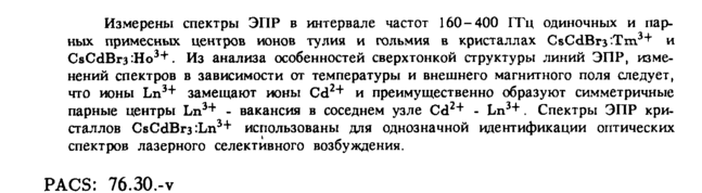 Измерены спектры ЭПР в интервале частот 160-400 ГГц одиночных и парных примесных центров ионов тулия и гольмия в кристаллах СвСсШгз :Тт3+ и СзСеШгз :Но3+. Из анализа особенностей сверхтонкой структуры линий ЭПР, изменений спектров в зависимости от температуры и внешнего магнитного поля следует, что ионы Ln3+ замещают ионы Cd2+ и преимущественно образуют симметричные парные центры Ln3+ вакансия в соседнем узле Cd2+ Ln3+. Спектры ЭПР кристаллов CsCdBn :Ln3+ использованы для однозначной идентификации оптических спектров лазерного селективного возбуждения. PACS: 76.30.-v