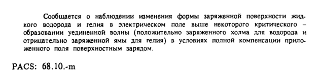 Сообщается о наблюдении изменения формы заряженной поверхности жидкого водорода и гелия в электрическом поле выше некоторого критического -образовании уединенной волны (положительно заряженного холма для водорода и отрицательно заряженной ямы для гелия) в условиях полной компенсации приложенного поля поверхностным зарядом. PACS: 68.10.-m