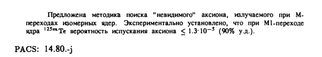 Предложена методика поиска "невидимого" аксиона, излучаемого при М-переходах изомерных ядер. Экспериментально установлено, что при Ml-переходе ядра ,25тТс вероятность испускания аксиона < 1.3' Ю-5 (90% у .д.). Ρ ACS: 14.80.-j