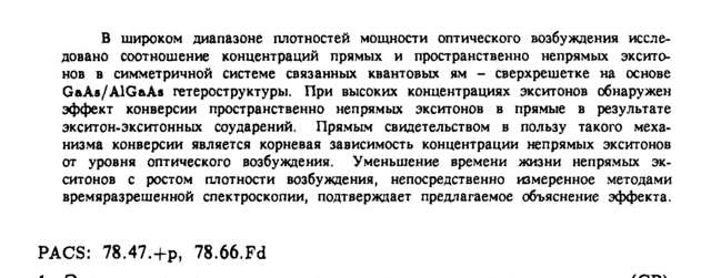 В широком диапазоне плотностей мощности оптического возбуждения исследовано соотношение концентраций прямых и пространственно непрямых эксито-нов в симметричной системе связанных квантовых ям сверхрешетке на основе GaAe/AlGaAs гетероструктуры. При высоких концентрациях экситонов обнаружен эффект конверсии пространственно непрямых экситонов в прямые в результате экситон-экситонных соударений. Прямым свидетельством в пользу такого механизма конверсии является корневая зависимость концентрации непрямых экситонов от уровня оптического возбуждения. Уменьшение времени жизни непрямых экситонов с ростом плотности возбуждения, непосредственно измеренное методами времяразрешенной спектроскопии, подтверждает предлагаемое объяснение эффекта. PACS: 78.47.+Р, 78.66.Fd