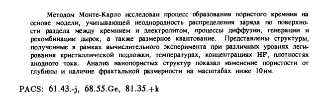 Методом Монте-Карло исследован процесс образования пористого кремния на основе модели, учитывающей неоднородность распределения заряда по поверхности раздела между кремнием и электролитом, процессы диффузии, генерации и рекомбинации дырок, а также размерное квантование. Представлены структуры, полученные в рамках вычислительного эксперимента при различных уровнях легирования кристаллической подложки, температурах, концентрациях HF, плотностях анодного тока. Анализ нанопористых структур показал изменение пористости от глубины и наличие фрактальной размерности на масштабах ниже 10нм. PACS: 61.43.-j, 68.55.Ge, 81.35.-fk