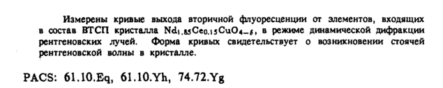 Измерены кривые выхода вторичной флуоресценции от элементов, входящих в состав ВТСП кристалла Ndi.&sCeo.isCuO^;, в режиме динамической дифракции рентгеновских лучей. Форма кривых свидетельствует о возникновении стоячей рентгеновской волны в кристалле. PACS: 61.10.Eq, 61.10.Yh, 74.72.Yg