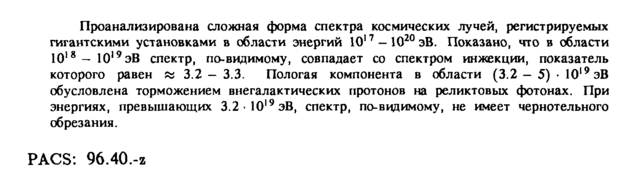 Проанализирована сложная форма спектра космических лучей, регистрируемых гигантскими установками в области энергий 10'7 1020 эВ. Показано, что в области 10'8-10|9эВ спектр, по-видимому, совпадает со спектром инжекции, показатель которого равен и 3.2-3.3. Пологая компонента в области (3.2 5) · 10" эВ обусловлена торможением внегалактических протонов на реликтовых фотонах. При энергиях, превышающих 3.2 10|9эВ, спектр, по-видимому, не имеет чернотельного обрезания. PACS: 96.40.-z