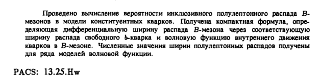 Проведено вычисление вероятности инклюзивного полулептонного распада В-мезонов в модели конституентных кварков. Получена компактная формула, определяющая дифференциальную ширину распада В-мезона через соответствующую ширину распада свободного Ь-кварка и волновую функцию внутреннего движения кварков в В-мезоне. Численные значения ширин полулептонных распадов получены для ряда моделей волновой функции. Ρ ACS: 13.25.Hw