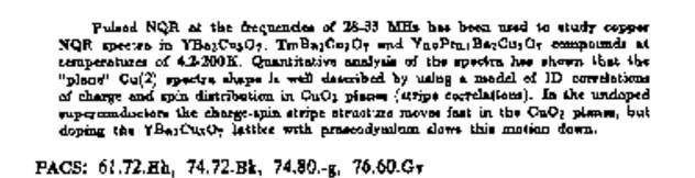 Pulsed NQR at the frequencies of 28-33 íî× hat been used to study copper NQR spectra in õ÷ÁÇóÉÚï?, ôÔ÷ÁÇóÉÚï? and Υ0.9ΡΌ.1 ÷ÁÇóÉÚï? compounds at temperatures of 4.2-200 K. Quantitative analysis of the spectra has shown that the "plane" Cu(2) spectra shape is well described by using a model of ID correlations of charge and spin distribution in óÉïÇ planes (stripe correlations). In the undoped superconductors the charge-spin stripe structure moves fast in the óÉ ï 2 planes, but doping the õ÷Á2óÉÚ<>7 lattice with praseodymium slows this motion down. PACS: 61.72.Hh, 74.72.Bk, 74.80.-g, 76.60.Gv