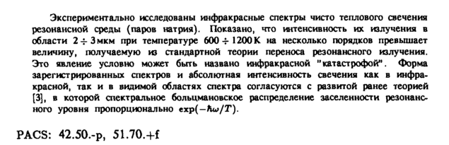 Экспериментально исследованы инфракрасные спектры чисто теплового свечения резонансной среды (паров натрия). Показано, что интенсивность их излучения в области 2ч-3мкм при температуре 600 -f 1200 К на несколько порядков превышает величину, получаемую из стандартной теории переноса резонансного излучения. Это явление условно может быть названо инфракрасной "катастрофой". Форма зарегистрированных спектров и абсолютная интенсивность свечения как в инфракрасной, так и в видимой областях спектра согласуются с развитой ранее теорией [3], в которой спектральное больцмановское распределение заселенности резонансного уровня пропорционально ехр(—Λω/Τ). PACS: 42.50.-p, 51.70.+f