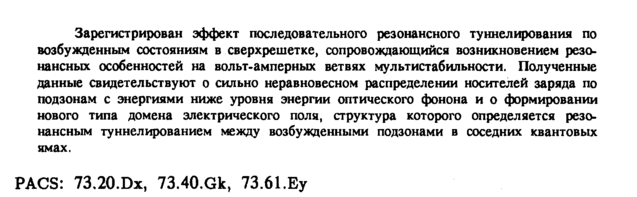 Зарегистрирован эффект последовательного резонансного туннелирования по возбужденным состояниям в сверхрешетке, сопровождающийся возникновением резонансных особенностей на вольт-амперных ветвях мультистабильности. Полученные данные свидетельствуют о сильно неравновесном распределении носителей заряда по подзонам с энергиями ниже уровня энергии оптического фонона и о формировании нового типа домена электрического поля, структура которого определяется резонансным туннелированием между возбужденными подзонами в соседних квантовых ямах. Ρ ACS: 73.20.Dx, 73.40.Gk, 73.61.Еу