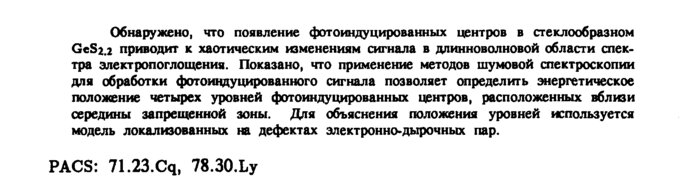 Обнаружено, что появление фотоиндуцированных центров в стеклообразном GeS2.2 приводит к хаотическим изменениям сигнала в длинноволновой области спектра электропоглощения. Показано, что применение методов шумовой спектроскопии для обработки фотоиндуцированного сигнала позволяет определить энергетическое положение четырех уровней фотоиндуцированных центров, расположенных вблизи середины запрещенной зоны. Для объяснения положения уровней используется модель локализованных на дефектах электронно-дырочных пар. PACS: 71.23.Cq, 78.30.Ly