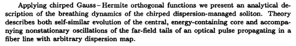 Applying chirped Gauss Hermite orthogonal functions we present an analytical description of the breathing dynamics of the chirped dispersion-managed soliton. Theory describes both self-similar evolution of the central, energy-containing core and accompanying nonstationary oscillations of the far-field tails of an optical pulse propagating in a fiber line with arbitrary dispersion map.
