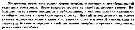 Обнаружена новая аллотропная форма аморфного кремния с яр-гибридизацией валентных электронов. Новое вещество состоит из линейных цепочек атомов. Небольшая часть атомов находится в »р2-состоянии, и они как мостики связывают линейные цепочки в случайную единую сетку. Данный вывод делается на основе анализа экспериментальных данных по влиянию отжига и ионной имплантации на структуру ближнего порядка и свойства пленок аморфного кремния, полученных различными способами.