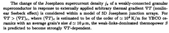 The change of the Josephson supercurrent density j» of a weakly-connected granular superconductor in response to externally applied arbitrary thermal gradient VT (nonlinear Seebeck effect) is considered within a model of 3D Josephson junction arrays. For VT > (VT)C, where (VT)C is estimated to be of the order of ~ 104 K/m for YBCO ceramics with an average grain's size d ~ 10 μ m, the weak-links-dominated thermopower S is predicted to become strongly VT-dependent.