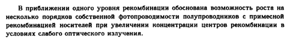 В приближении одного уровня рекомбинации обоснована возможность роста на несколько порядков собственной фотопроводимости полупроводников с примесной рекомбинацией носителей при увеличении концентрации центров рекомбинации в условиях слабого оптического излучения.