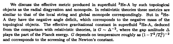 We discuss the effective metric produced in superfluid 3He-A by such topological objects as the radial disgyration and monopole. In relativistic theories these metrics are similar to that of the local string and global monopole correspondingly. But in 3He-A they have the negative angle deficit, which corresponds to the negative mass of the topological objects. The effective gravitational constant in superfluid 3He-A, deduced from the comparison with relativistic theories, is G ~ Δ-2, where the gap amlitude Δ plays the part of the Planck energy. G depends on temperature roughly as (1 — T2/T2)~2 and corresponds to the screening of the Newton's constant.