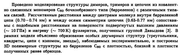 Проведено моделирование структуры димеров, тримеров и цепочек из ковалент-но связанных мономеров Ceo бочкообразного типа (барреленов) с различными типами связей. Рассчитанные расстояния между центрами молекул внутри барреленной цепи (0.70-0.74 нм) и между осями симметрии цепочек (0.63-0.77 нм) сопоставимы с подобными расстояниями на поверхности подвергнутых высоким давлениям (~ ЮГПа) и нагреву (~ 700К) фуллеритов, полученных группой Давыдова [3]. В рамках модели объяснено образование особых двумерных структур (треугольники, квадраты, цепи с изломом, звезды), наблюдаемых экспериментально, и построены 3D полимерные структуры из барреленов Ceo с плотностью, близкой к плотности полученных ранее образцов.