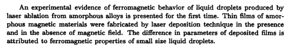 An experimental evidence of ferromagnetic behavior of liquid droplets produced by laser ablation from amorphous alloys is presented for the first time. Thin films of amorphous magnetic materials were fabricated by laser deposition technique in the presence and in the absence of magnetic field. The difference in parameters of deposited films is attributed to ferromagnetic properties of small size liquid droplets.