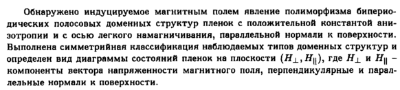 Обнаружено индуцируемое магнитным полем явление полиморфизма биперио-дических полосовых доменных структур пленок с положительной константой анизотропии и с осью легкого намагничивания, параллельной нормали к поверхности. Выполнена симметрийная классификация наблюдаемых типов доменных структур и определен вид диаграммы состояний пленок на плоскости (Н±,Н^)1 где Н± и Щ -компоненты вектора напряженности магнитного поля, перпендикулярные и параллельные нормали к поверхности.
