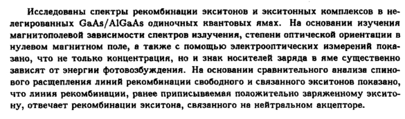 Исследованы спектры рекомбинации экситонов и экситонных комплексов в нелегированных GaAs/AiGaAs одиночных квантовых ямах. На основании изучения магнитополевой зависимости спектров излучения, степени оптической ориентации в нулевом магнитном поле, а также с помощью электрооптических измерений показано, что не только концентрация, но и знак носителей заряда в яме существенно зависят от энергии фотовозбуждения. На основании сравнительного анализа спинового расщепления линий рекомбинации свободного и связанного экситонов показано, что линия рекомбинации, ранее приписываемая положительно заряженному эксито-ну, отвечает рекомбинации экситона, связанного на нейтральном акцепторе.