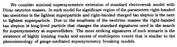 We consider minimal supersymmetric extension of standard electroweak model with Dirac neutrino masses. In such model for significant region of the parameters right-handed tau sneutrino is the lightest superparticle and right-handed charged tau slepton is the next to lightest superparticle. Due to the smallness of the neutrino masses the right-handed tau slepton is long-lived particle that changes the standard signatures used in the search for supersymmetry at supercolliders. The most striking signatures of such scenario is the existence of highly ionizing tracks and excess of multilepton events that is similar to the phenomenology of gauge-mediated supersymmetry breaking models.