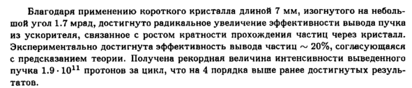 Благодаря применению короткого кристалла длиной 7 мм, изогнутого на небольшой угол 1.7 мрад, достигнуто радикальное увеличение эффективности вывода пучка из ускорителя, связанное с ростом кратности прохождения частиц через кристалл. Экспериментально достигнута эффективность вывода частиц ~ 20%, согласующаяся с предсказанием теории. Получена рекордная величина интенсивности выведенного пучка 1.9 Ί011 протонов за цикл, что на 4 порядка выше ранее достигнутых результатов.