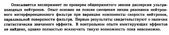 Описывается эксперимент по проверке общепринятого закона дисперсии ультрахолодных нейтронов. Опыт основан на поиске смещения линии резонанса нейтронного интерференционного фильтра при вариации компоненты скорости нейтронов, параллельной поверхности фильтра. Первые результаты свидетельствуют о наличии статистически значимого эффекта. В контрольном опыте имитирующих эффектов не найдено, однако полностью исключить такую возможность пока невозможно.