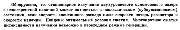 Обнаружено, что стационарное излучение двухуровневого одномодового лазера с некогерентной накачкой может находиться в неклассическом (субпуассоновском) состоянии, если скорость спонтанного распада ниже скорости потерь резонатора и скорости накачки. Найдены оптимальные условия сжатия. Многократное сжатие интенсивности излучения возможно в переходном режиме генерации.