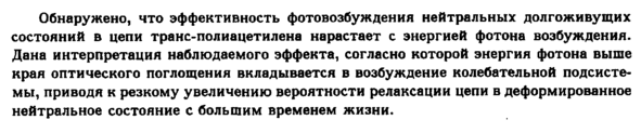 Обнаружено, что эффективность фотовозбуждения нейтральных долгоживущих состояний в цепи транс-полиацетилена нарастает с энергией фотона возбуждения. Дана интерпретация наблюдаемого эффекта, согласно которой энергия фотона выше края оптического поглощения вкладывается в возбуждение колебательной подсистемы, приводя к резкому увеличению вероятности релаксации цепи в деформированное нейтральное состояние с большим временем жизни.