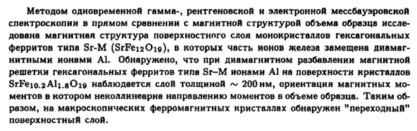 Методом одновременной гамма-, рентгеновской и электронной мессбауэровской спектроскопии в прямом сравнении с магнитной структурой объема образца исследована магнитная структура поверхностного слоя монокристаллов гексагональных ферритов типа Sr-M (SrFe^Oig), в которых часть ионов железа замещена диамагнитными ионами А1. Обнаружено, что при диамагнитном разбавлении магнитной решетки гексагональных ферритов типа Sr-M ионами А1 на поверхности кристаллов SrFe10.2Al1.eOi8 наблюдается слой толщиной ~ 200 нм, ориентация магнитных моментов в котором неколлинеарна направлению моментов в объеме образца. Таким образом, на макроскопических ферромагнитных кристаллах обнаружен "переходный" поверхностный слой.