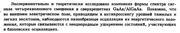 Экспериментально и теоретически исследовано изменение формы спектра сигнала четырехволнового смешения в сверхрешетках GaAs/AlGaAs. Показано, что во внешнем электрическом поле, приводящем к антикроссингу уровней тяжелых и легких экситонов, наблюдаются пилообразные осцилляции их энергетического положения, которые связываются с неоднородным уширением состояний, участвующих в блоховских осцилллциях.