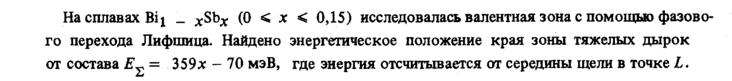 На сплавах Bij _ xShx (0 < χ < 0,15) исследовалась валентная зона с помощью фазового перехода Лифшица. Найдено энергетическое положение края зоны тяжелых дырок от состава 2Γν = 359χ 70 мэВ, где энергия отсчитывается от середины щели в точке L.