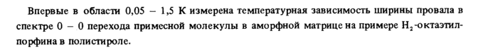 Впервые в области 0,05 1,5 К измерена температурная зависимость ширины провала в спектре 0-0 перехода примесной молекулы в аморфной матрице на примере Н2-октаэтил-порфина в полистироле.