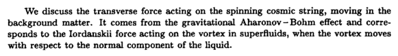 We discuss the transverse force acting on the spinning cosmic string, moving in the background matter. It comes from the gravitational Aharonov Bohm effect and corresponds to the Iordanskii force acting on the vortex in superfluids, when the vortex moves with respect to the normal component of the liquid.