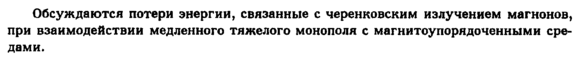 Обсуждаются потери энергии, связанные с черенковским излучением магнонов, при взаимодействии медленного тяжелого монополя с магнитоупорядоченными средами.