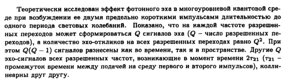 Теоретически исследован эффект фотонного эха в многоуровневой квантовой среде при возбуждении ее двумя предельно короткими импульсами длительностью до одного периода световых колебаний. Показано, что на каждой частоте разрешенных переходов может сформироваться Q сигналов эха (Q число разрешенных переходов), а количество эхо-откликов на всех разрешенных переходах равно Q2. При этом Q(Q — 1) сигналов разнесены как во времени, так и в пространстве. Другие Q эхо-сигналов всех разрешенных частот, возникающие в момент времени 2τ2ΐ (τ2ΐ ~ промежуток времени между подачей на среду первого и второго импульсов), колли-неарны друг другу.